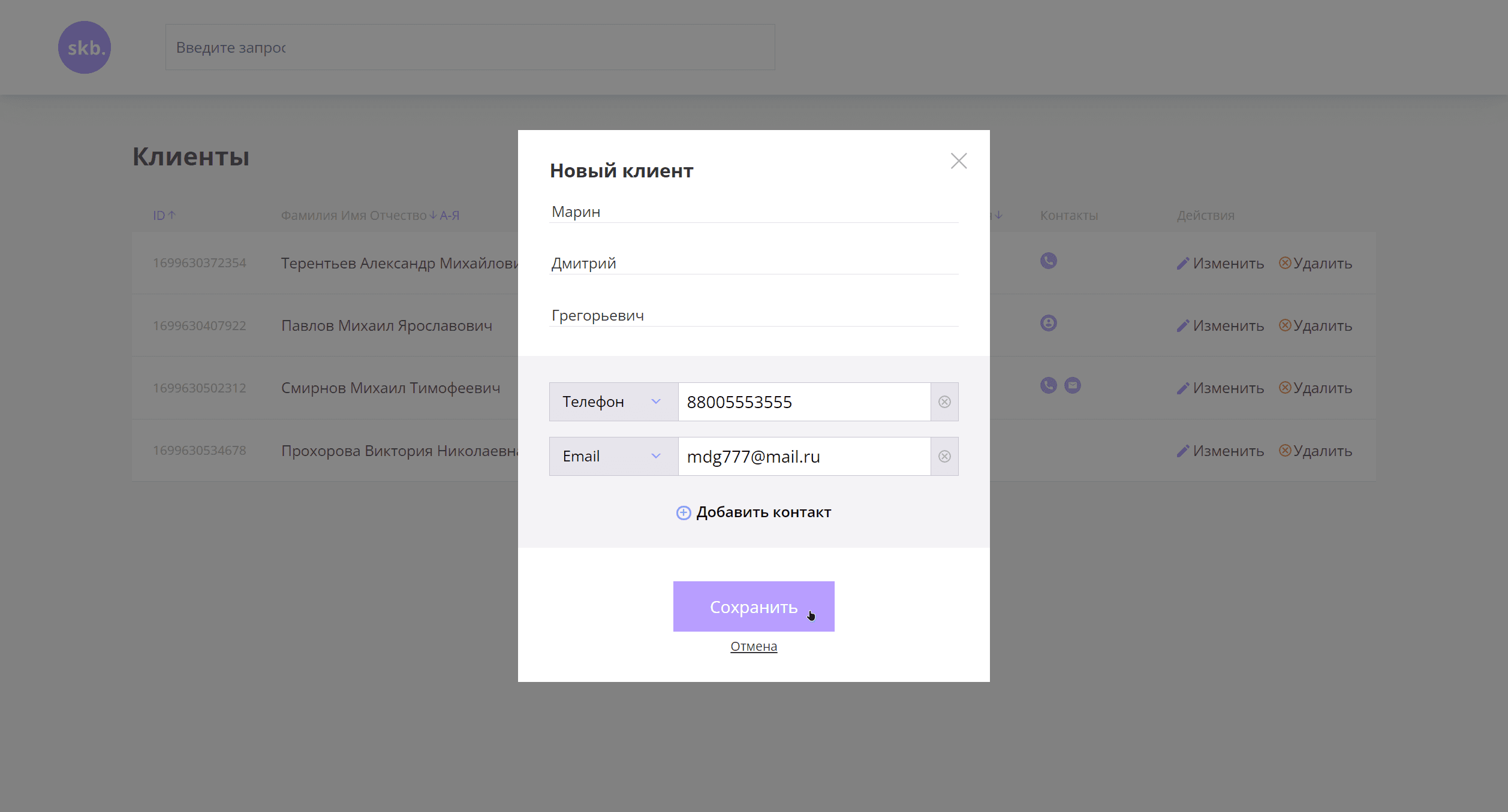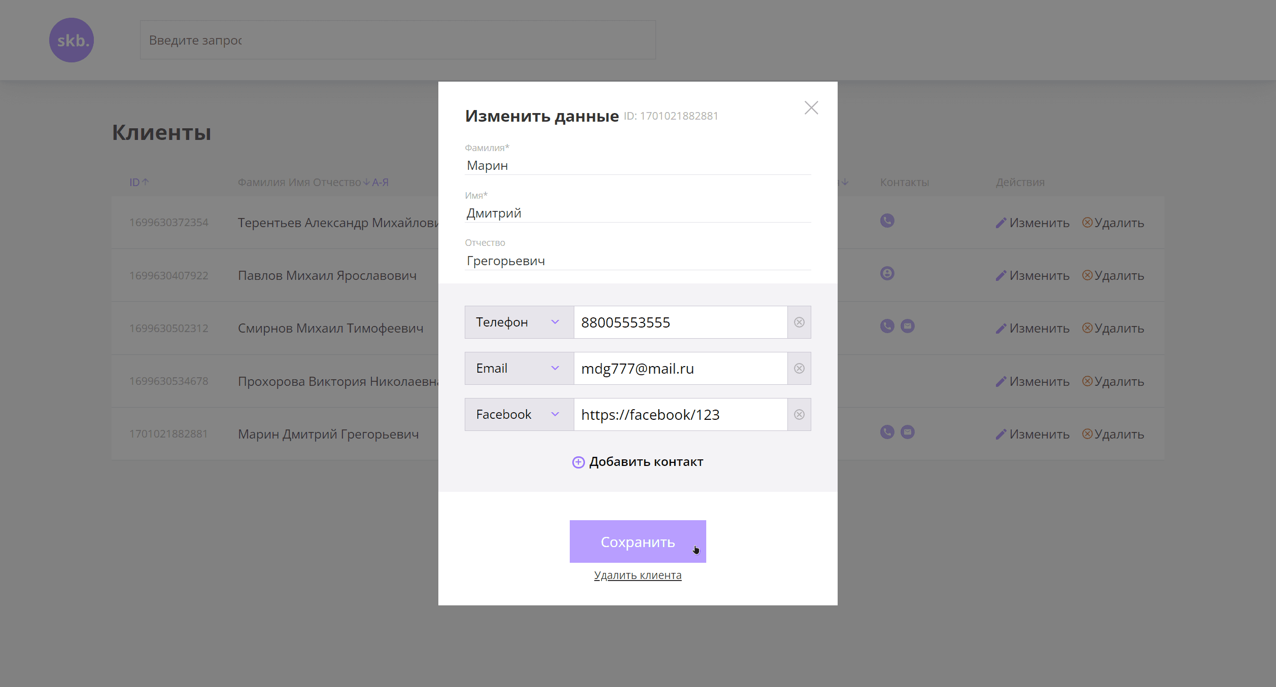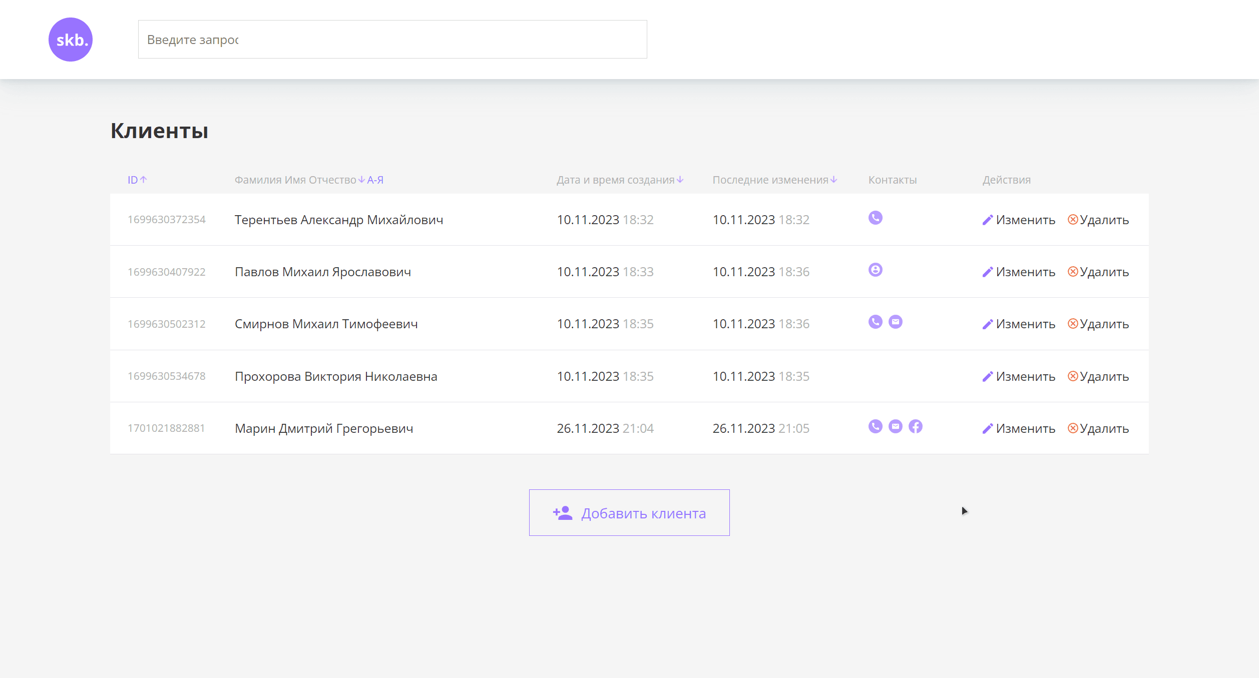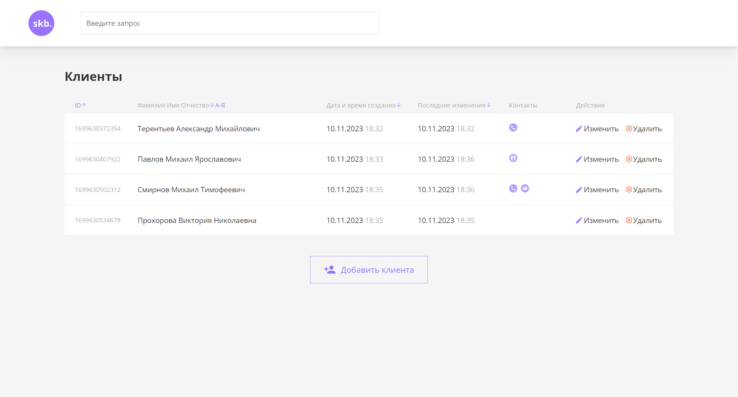 Это CRM система управления контактными данными клиентов разработана для компании «SkillBus». Функционал: Возможность добавлять клиента в список, удалять, изменять; Клиенту можно добавить контакты(телефон, почту и др); Возможность список по дате создания, изменения, по Фамилии, Имени и Отчеству; Анимация открытия модального окна; Валидация формы перед отправкой на сервер; Индикация загрузки; Поиск с автодополнением.
