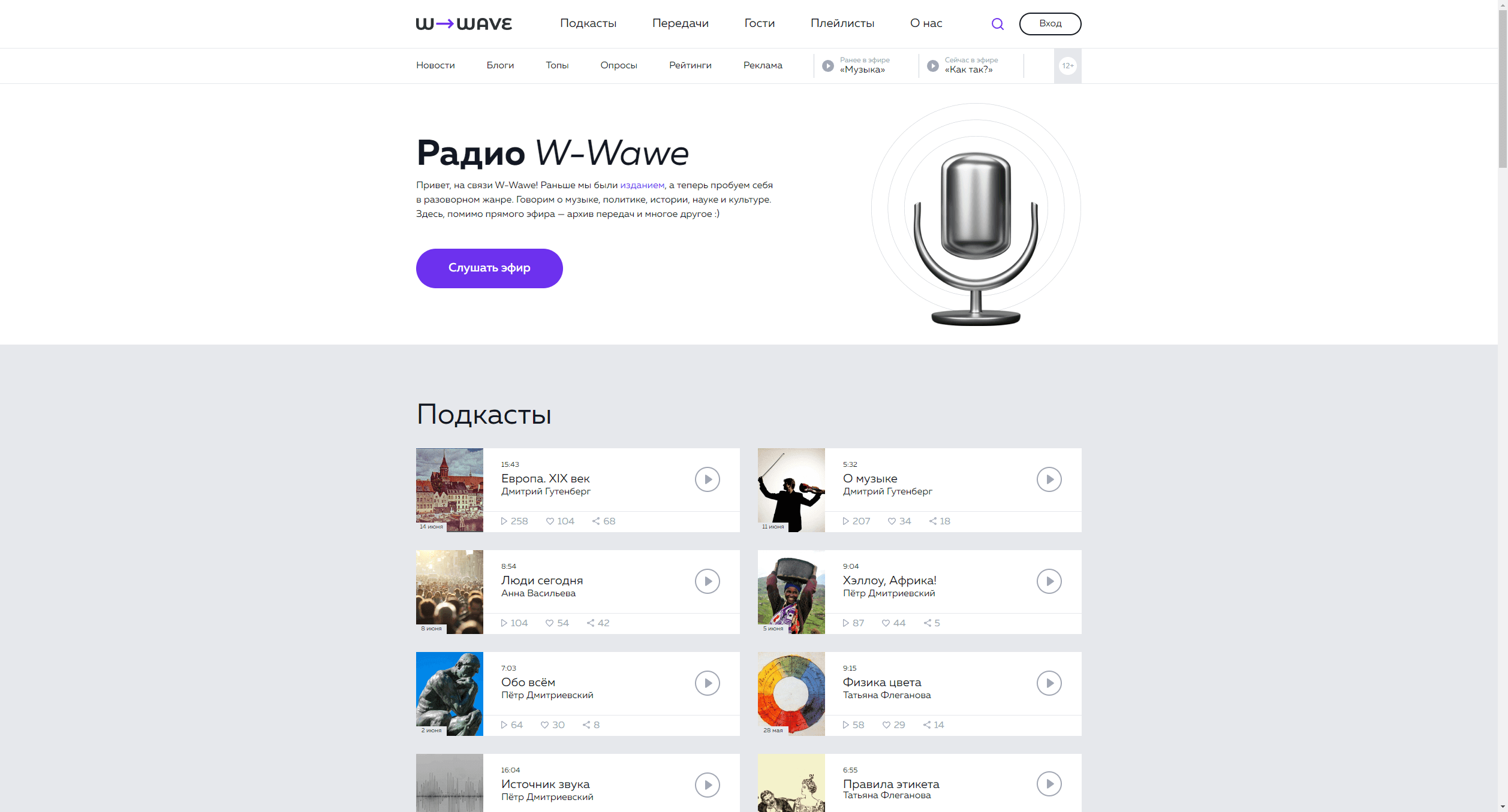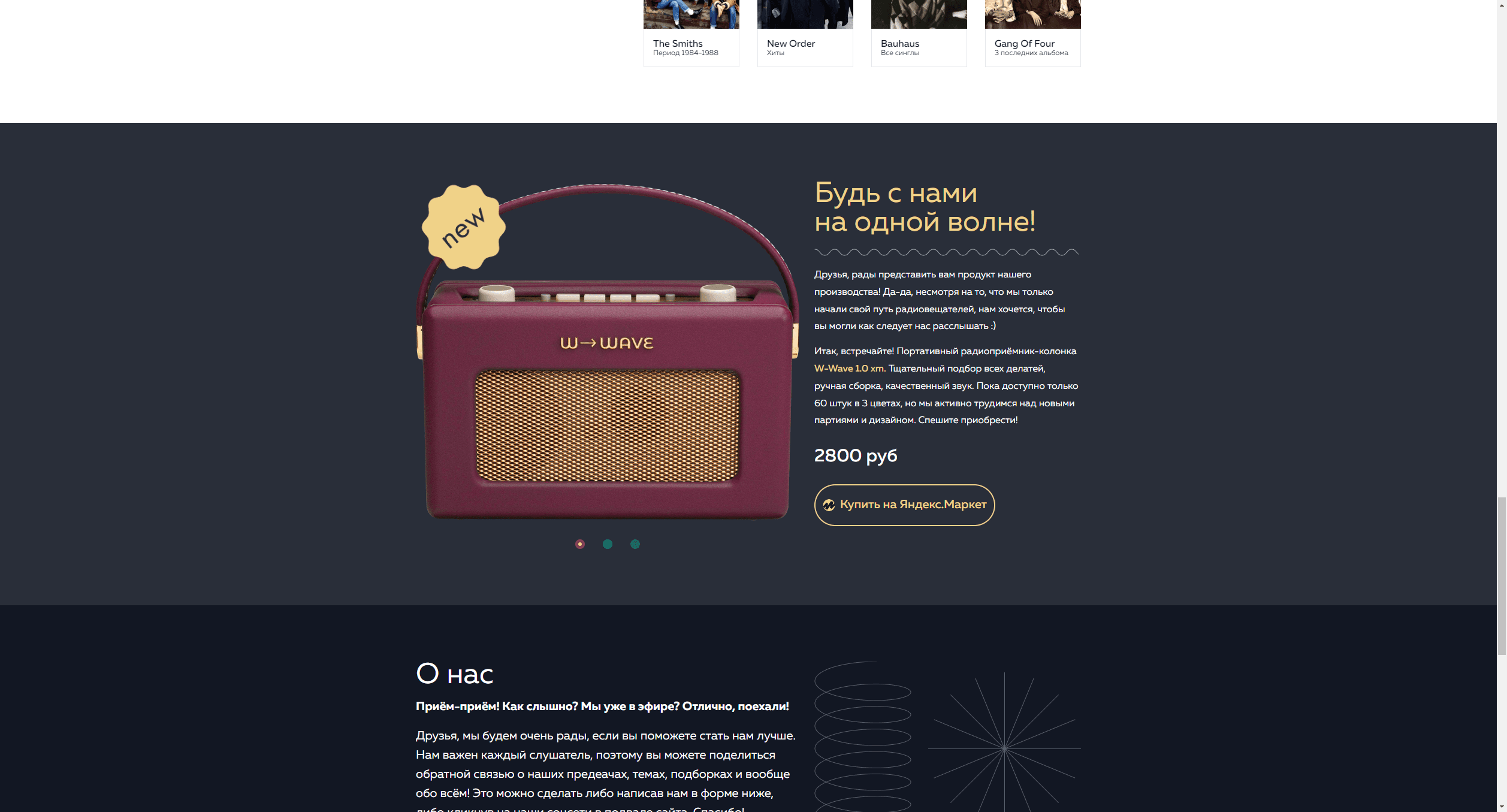 Это одностраничный сайт который является вымышленной радиоплощадкой «W-Wave-Radio». Предполагается что пользователь будет слушать радио в прямом эфире, ранее записанные подкасты, передачи и т. д., а также видеть информацию о ведущих эфиров и о самом радио. При создании сайта использовал методологию БЭМ а также предпроцессор SASS. В качестве сборщика использовался Webpack.